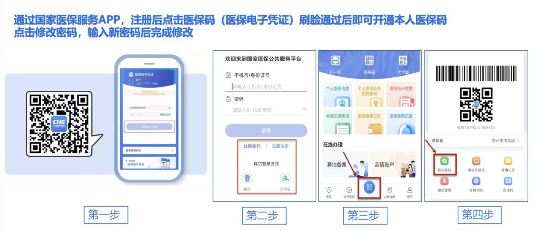 渠道一:下載國家醫(yī)保服務(wù)APP,注冊(cè)成功后點(diǎn)擊醫(yī)保碼(醫(yī)保電子憑證),在醫(yī)保碼界面點(diǎn)擊修改密碼,刷臉通過后進(jìn)行修改、保存。