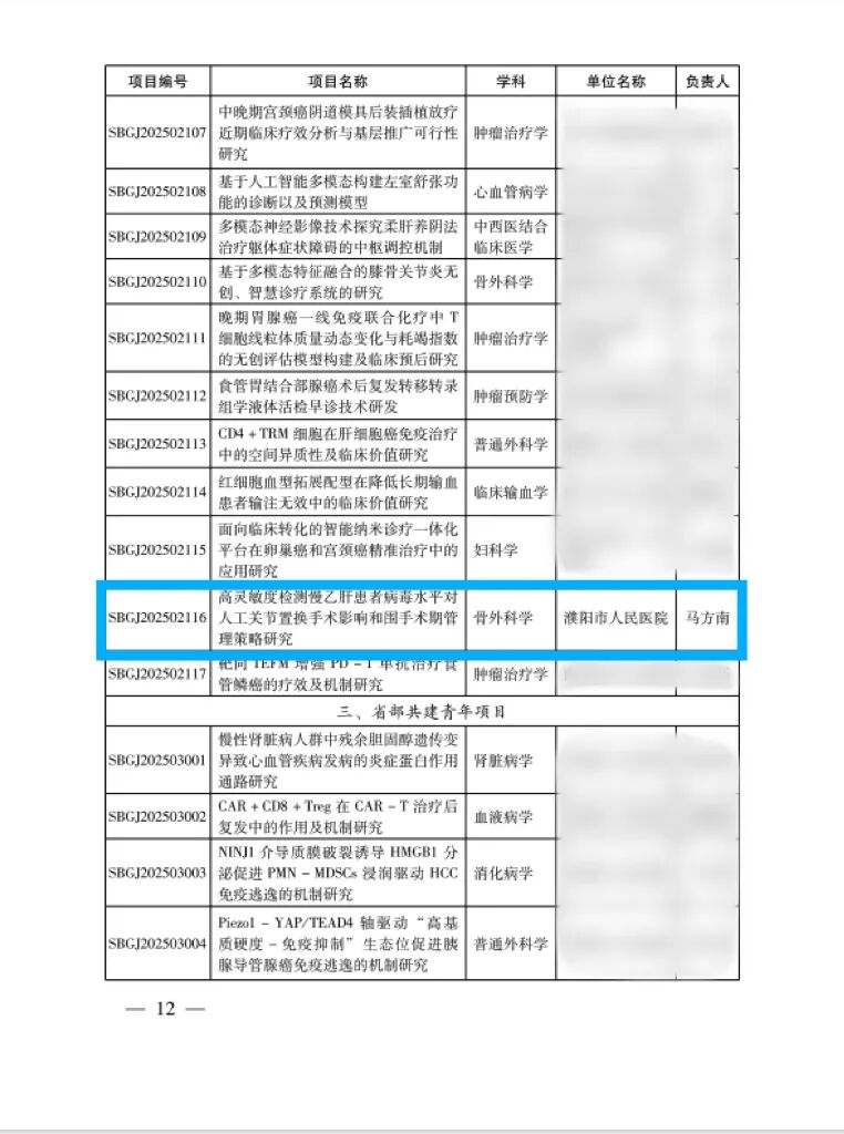 近日,河南省醫(yī)學(xué)科技攻關(guān)計(jì)劃項(xiàng)目立項(xiàng)結(jié)果正式揭曉,濮陽(yáng)市人民醫(yī)院申報(bào)的《高靈敏度檢測(cè)慢乙肝患者病毒水平對(duì)人工關(guān)節(jié)置換手術(shù)影響和圍手術(shù)期管理策略研究》成功獲批省部共建重點(diǎn)項(xiàng)目立項(xiàng)。河南省醫(yī)學(xué)科技攻關(guān)省部共建重點(diǎn)項(xiàng)目緊密圍繞區(qū)域臨床需求和醫(yī)療技術(shù)瓶頸問(wèn)題,聚焦衛(wèi)生健康關(guān)鍵技術(shù)研究,對(duì)項(xiàng)目的創(chuàng)新性、實(shí)用性和引領(lǐng)性設(shè)置了嚴(yán)格標(biāo)準(zhǔn),全省每年僅支持100項(xiàng),地市級(jí)醫(yī)院僅有數(shù)項(xiàng)獲得立項(xiàng)支持,作為代表濮陽(yáng)市地區(qū)獲得立項(xiàng)的該類項(xiàng)目,標(biāo)志著我院在骨科與感染性疾病交叉領(lǐng)域的科研創(chuàng)新能力獲得了省級(jí)權(quán)威認(rèn)可。